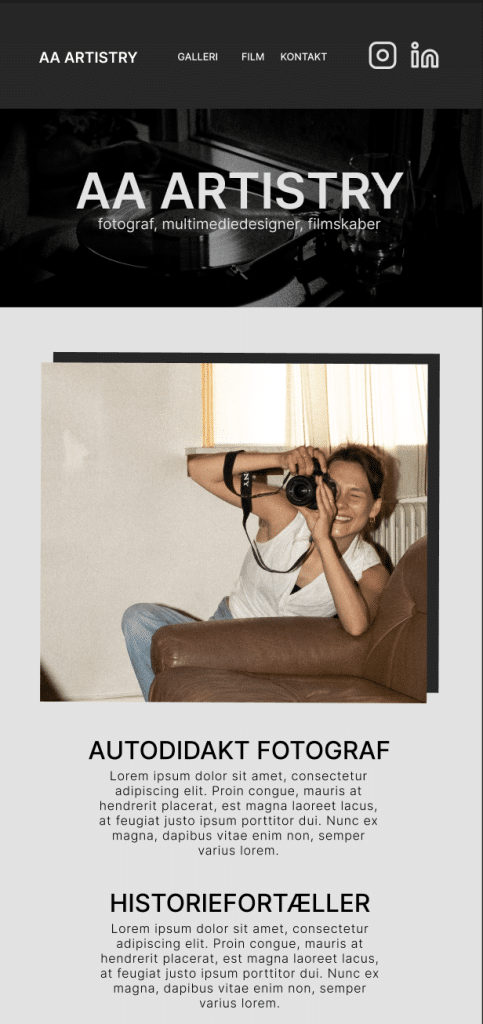 Derfor valgte jeg neutrale farver og en moderne typografi. Valget af dette var også, fordi jeg ikke ville risikerer at hjemmesidens farver clashede med mine billedere. Billederne får lov til at være farven på hjemmesiden.