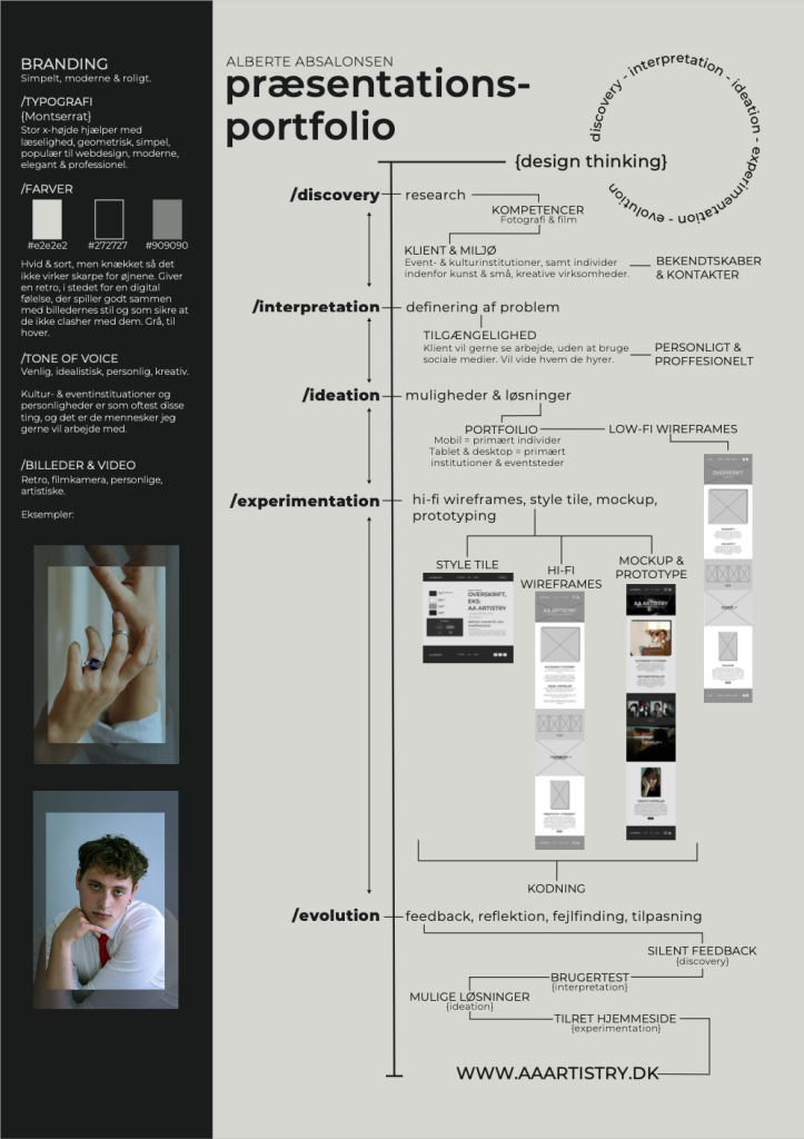 Jeg startede projektet med at undersøge og researche min målgruppe, hvilke kompetencer jeg kunne tilbyde dem. Min målgruppe de seneste år, har været mennesker og institutioner inden for kultur. Jeg har arbejdet inden for film og fotografi, siden 2021 og har planer om at fortsætte den vej. Derfor ville det give mening for mig, at fortsætte den vej og målrette mit portfolio mod disse mennesker.